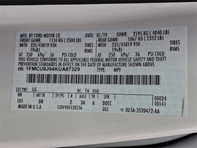 2019 Ford Escape Titanium Escape Titanium, 4D Sport Utility, EcoBoost 2.0L I4 GTDi DOHC Turbocharged VCT, 6-Speed Automatic, 4WD, White Platinum, Charcoal Black Leather, 2.0L EcoBoost Class II Trailer Tow Package, Auxiliary Transmission Oil Cooler, Equipment Group 400A, Navigation System.